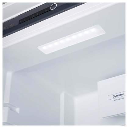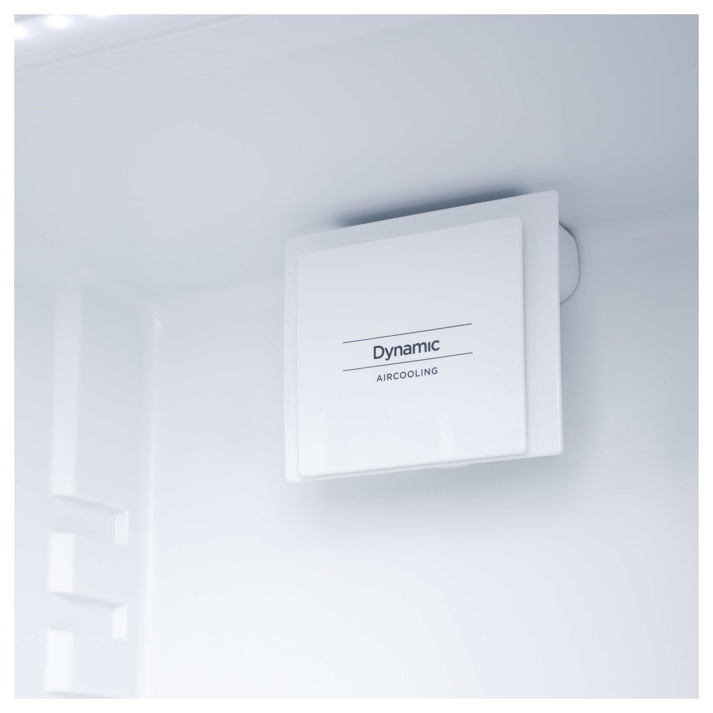 Специальный вентилятор в холодильной камере обеспечивает перемешивание воздуха и соответственно равномерное распределение температуры. Также динамическая система способствует уменьшению, смешиванию запахов в холодильнике и быстрому охлаждению большого количества продуктов.