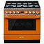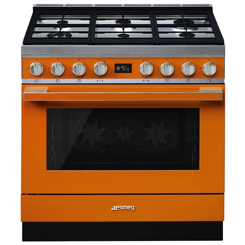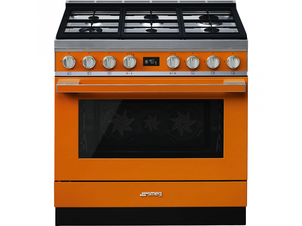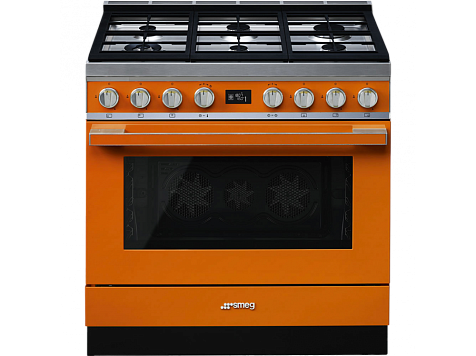 Варочный центр Smeg CPF9GPOR из серии Portofino выполнен в теплом оранжевом цвете. Конструкция включает наличие газовой варочной панели и электрического духового шкафа. Варочная поверхность имеет автоматический электроподжиг для быстрого зажигания пламени, а духовой шкаф оснащен функцией пиролитической очистки.