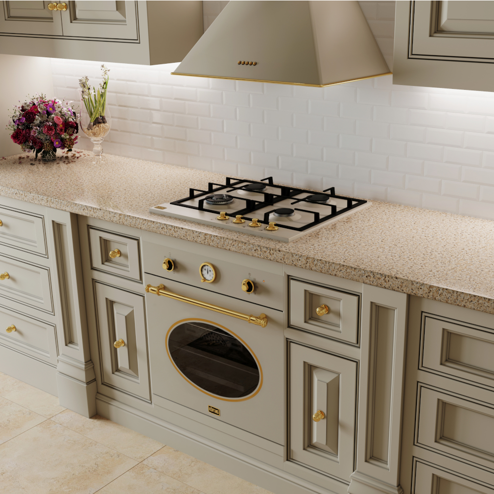 Это утонченные цвета, бронзовая или деревянная окантовка кухонной вытяжки, которые создают идеальное сочетание с натуральными материалами и фурнитурой кухонной мебели в классическом или ретро стиле.